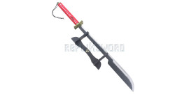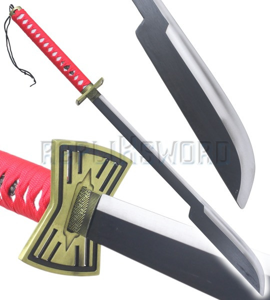 Magnifique reproduction de « l'epee sans nom », le katana de Kenpachi.La lame en acier stainless steel 440, est pré-affutée mais non tranchante.Le tsuba (garde) en forme de losange est faite en métal finition bronze.Fourreau en bois recouvert de coton.Longueur totale : 110cmLongueur de la lame : 68cmPoids total : 960grsIdeal pour les cosplays.