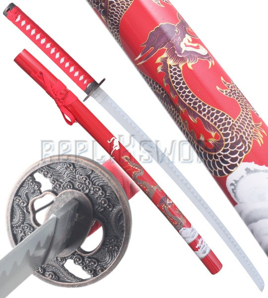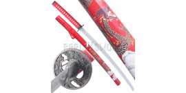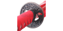 Magnifique katana de décoration.La lame en acier 440 stainless steel est pré-affutée mais non tranchante. Le pommeau et le superbe tsuba (garde) sont en métal vieilli.Le fourreau en bois laqué rouge est gravé d'un dragon et a un poignée en simili cuir. Longueur de la lame : 70cmLongueur total : 103cmVente interdite aux mineurs.Une exclusivité RepliKsword.