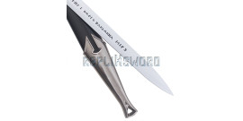 Magnifique replique du Dague du Witch-King dans le film "le Seigneur des Anneaux". Lame en acier 440 non coupante, manche recouvert de cuir. Garde et pommeau en acier. longueur totale : 63cm Longueur de la lame : 42cm Poids dague : 600grs Dimension plaque : 21 x 31cm Livrée avec sa plaque murale en bois.
