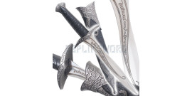 Sublime et élégante reproduction du sabre d'Arwen du Seigneur des Anneaux.L'épée de l'Elfe Arwen porte le nom Hadhafang qui signifie le défenseur. Lame en acier non tranchante courbée finement travaillée et ornée d'écritures elfiques dorées.Livré avec son support en bois décoré.Longueur total: 97cmLongueur de la lame : 76cmSuperbe piece de collection.Une...