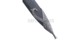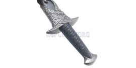 Superbe réplique de la dague Aragorn reçue des elfes dans le film "Le seigneur des anneaux". La lame en acier inox, pré-affutée mais non tranchante, est gravée d'écritures elfiques. Le manche est en imitation bois d'accajou. Fourreau recouvert de simili cuir. Longueur totale : 50 cm Livré avec sa plaque murale en bois. Une exclusivité RepliKsword.