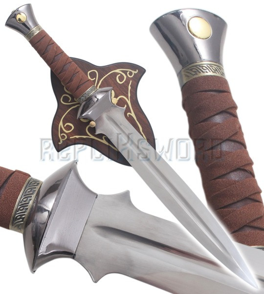 Superbe réplique de la dague Aragorn reçue des elfes dans le film "Le seigneur des anneaux". La lame en acier inox, pré-affutée mais non tranchante, est gravée d'écritures elfiques. Le manche est en imitation bois d'accajou. Fourreau recouvert de simili cuir. Longueur totale : 50 cm Livré avec sa plaque murale en bois. Une exclusivité RepliKsword.