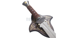 Superbe reproduction de l'épée de Boromir dans la trilogie "Le seigneur des anneaux".La lame en acier stainless steel 440, pré-affutée mais non tranchante avec gorge.Support murale en bois richement décoré fournis.Longueur totale : 95cmLongueur de la lame : 71cmMagnifique pièce de collection.Une exclusivité RepliKsword.