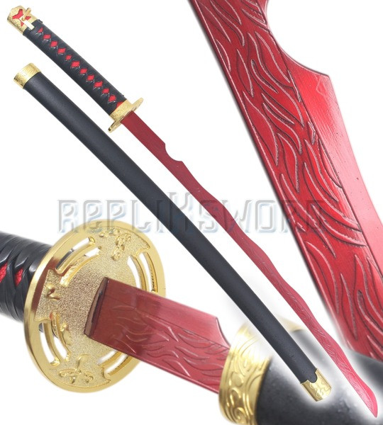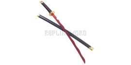 Superbe reproduction du katana de Zoro Roronoa, l'épée Shusui dite "L'eau Automnale" du Manga "One Piece".Zoro porte le sabre a sa main droite.Sa lame en acier inoxydable 440 stainless steel est noire avec motif rouge.Lame non tranchante.Fourreau en bois noir avec motif sur tout le long. Ornement en acier a chaque extremité du fourreau. Garde en acier....