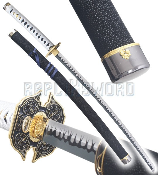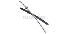 Superbe reproduction du katana de Zoro Roronoa, l'épée Shusui dite "L'eau Automnale" du Manga "One Piece".Zoro porte le sabre a sa main droite.Sa lame en acier inoxydable 440 stainless steel est noire avec motif rouge.Lame non tranchante.Fourreau en bois noir avec motif sur tout le long. Ornement en acier a chaque extremité du fourreau. Garde en acier....
