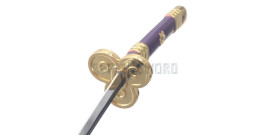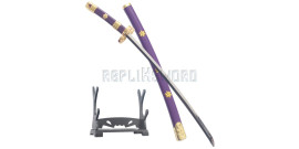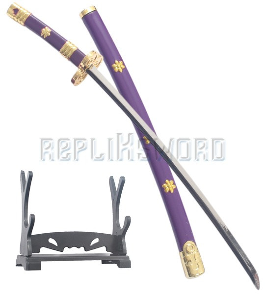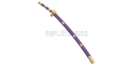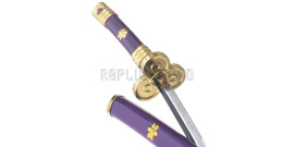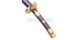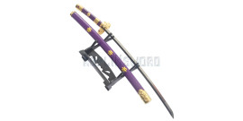 Magnifique replique de l'épée de trafalgar tiré du manga One Piece. Replique du mini katana en bois. La lame decorée est en bois peint. La garde est en ABS entouré d'un coton blanc. Manche tressé de cotton violet. Longueur totale : 45cm Longueur de la lame : 27cm Poids epee et fourreau : 110grs Poids epee : 60grs Livré avec son Presentoir en ABS noir.
